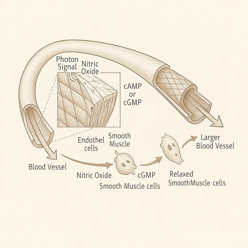 GlowPatch™ uses a proprietary, non-invasive light to help your body’s blood vessels relax. When this precise (wavelength and intensity) light is shined on the skin, it triggers the release of a substance called nitric oxide. This substance tells the smooth muscles around blood vessels to relax, which makes the vessels wider. Wider blood vessels improve blood flow, delivering more oxygen and nutrients to tissues. This process helps the body heal, reduces discomfort, and supports healthy function in organs and tissues.